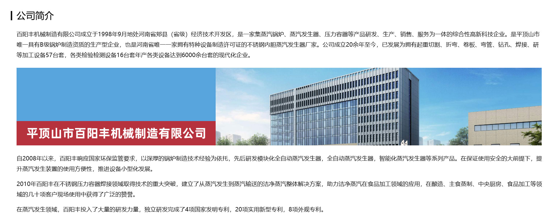百陽豐機械制造有限公司成立于1998年9月地處河南省郟縣(省級)經濟技術開發區,是一家集蒸汽鍋爐、蒸汽發生器、壓力容器等產品研發、生產、銷售、服務為一體的綜合性高新科技企業。是平頂山市一家具有B級鍋爐制造資質的生產型企業,也是一家擁有特種設備制造許可證的不銹鋼內膽蒸汽發生器廠家。公司成立20余年至今,已發展為擁有起重切割、折彎、卷板、彎管、鉆孔、焊接、研等加工設備57臺套,各類檢驗檢測設備16臺套年產各類設備達到6000余臺套的現代化企業。